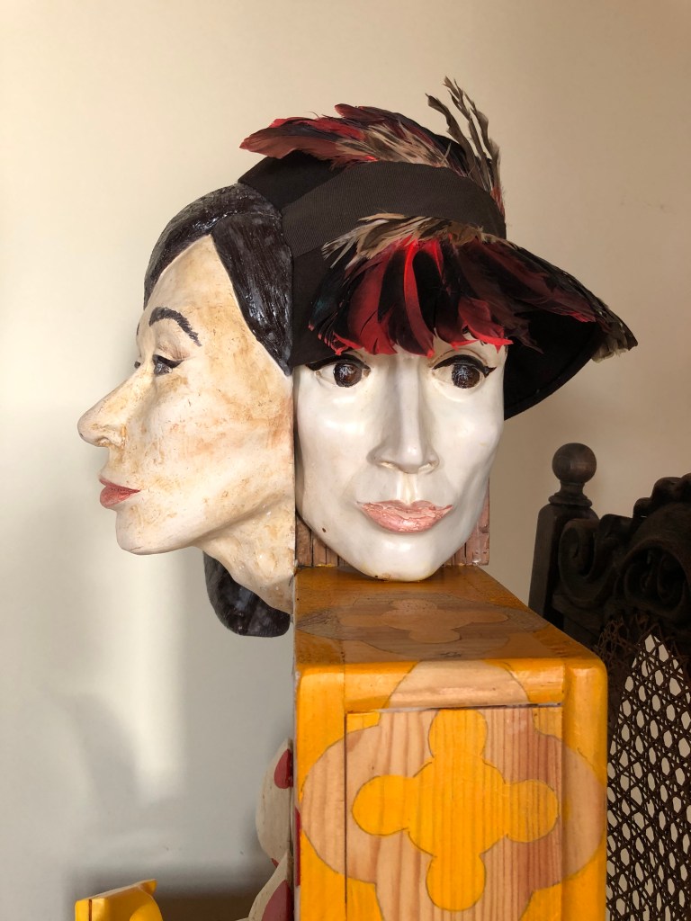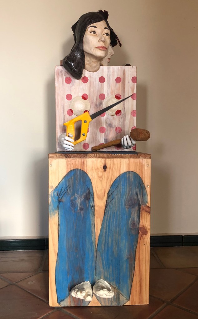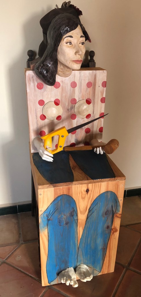Mixed media – wood, ceramic, resin, plastic, fabric, feathers